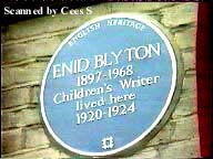 nog twee zoontjes krijgen: Hanly en Carey. Amper drie maanden oud kreeg Enid kinkhoest. Het werd zo erg dat de dokter vreesde dat ze de volgende dag niet zou halen. Haar vader wiegde haar de hele nacht in zijn armen en Enid overleefde de ziekte. Later hebben ze allebei lang gedacht dat daarom de band tussen vader en dochter zo stevig werd. De familie van haar vaders kant was erg artistiek; een zuster van hem was pianiste en het was haar vaders bedoeling dat Enid dat ook zou worden. Haar moeder was het daar helemaal niet mee eens; meisjes waren voorbestemd om een dienstbaar leven te leiden; dienstmeid worden, trouwen en kinderen krijgen. Boeken en muziek interesseerden haar niet. Enid kon niet goed met haar moeder opschieten. Maar haar vader ontfermde zich over haar en vanaf haar zesde jaar ging hij vaak met haar wandelen en leerde haar van alles over planten en dieren, muziek en literatuur. Intussen verhuisden ze enkele malen en kwamen tenslotte terecht in Beckenham, in zuidoost-Londen. Daar ging ze van 1907 tot 1915 naar St. Christophers School for girls. Enid was erg gehecht geraakt aan haar vader en het was dan ook een enorme schok, toen hij en haar moeder uit elkaar gingen. Dat gebeurde in 1910, toen ze 13 jaar was. Haar vader verhuisde en zodoende kon Enid niet meer over haar favoriete onderwerpen praten. Bovendien mocht ze van haar moeder met niemand over de scheiding praten; in die Edwardiaanse tijd was de 'schone schijn' erg belangrijk en het bekend worden van de affaire zou een schandaal veroorzaken. Enid vluchtte in haar fantasiewereld en vertelde dat haar vader op reis was. Ook haar verhalen over kunst, de natuur, muziek en al die andere prachtige dingen kwamen in haar fantasie terecht. Daarom begon ze veel te schrijven en ze hield ook een dagboek bij. Later zullen we zien, dat de schok niet alleen psychische gevolgen had. Samen met 2 vriendinnen richtte ze een tijdschrift op, dat ze D.A.B. noemden; de naam is samengesteld uit hun eigen namen: Mirabel Davis, Mary Attenborough en Enid Blyton. Er stonden meestal korte verhalen van Enid in, gedichten van Mirabel en tekeningen van Mary. Toen ze 19 was, kwam Enid erachter dat ze helemaal geen pianiste wilde worden. Ze had ontdekt dat kinderen aan haar lippen hingen als ze verhalen vertelde. Dus ging ze voor onderwijzeres studeren. Ze werkte na die studie ook inderdaad twee jaar op een jongensschool, en daarna woonde ze nog vier jaar als goevernante bij een gezin in Surbiton, Zuid-Londen. Haar eerste boek, de dichtbundel "Child Whispers", kwam uit in 1922. Op 11 augustus 1997 werd op het huis in Surbiton een plaquette onthuld met het opschrift "Enid Blyton 1897-1968. Children's Writer, lived here, 1920-1924". In '24 verdiende ze voldoende om haar baan als goevernante op te kunnen geven. In augustus 1924 trouwde ze met Hugh Pollock; hij was haar redakteur bij de uitgeverij Newnes, die een deel van haar werk uitgaf. Ze woonden eerst in een flat in de Londense wijk Chelsea, maar allebei hielden ze zo van de natuur, dat ze zich al snel beklemd voelden in de grote drukke stad. Ze verlangden naar het buitenleven, en in 1926 vonden ze een landelijk huisje in Beckenham, toen nog een rustig plaatsje aan de rand van Londen. Ze noemden hun stekje Elfin Cottage (Elfenhuisje). Er volgden een tiental idyllische jaren voor Enid. Ze schreef, naast haar eigen boeken, ook veel artikelen over dieren en planten voor allerlei bladen, en was ze redakteur van drie delen van "Teacher's Treasury", een onderwijs-blad. Ook haar hond Bobs was vaak onderwerp van haar artikelen. Ze schreef zelfs artikelen die zogenaamd door Bobs geschreven waren; later zijn ze in boekvorm uitgegeven. Ze verdiende in 1926 ongeveer 1200 pond (nu zou dat 50.000 pond zijn), en dat was meer dan Hugh op zijn werk verdiende. Je kunt dus wel stellen dat ze een zelfstandig leven kon leiden, en dat deed ze in feite ook, omdat Hugh de hele dag op kantoor was. Hoewel haar moeder nog steeds in Beckenham woonde, slechts op een paar kilometers afstand van Elfin Cottage, is het niet bekend ze elkaar ooit hebben opgezocht in die periode. In het onderwijs-tijdschrift "Teacher's World", uitgegeven door Newnes, kreeg ze een vaste column en in het nummer van 26 oktober 1926 kwam er een uitgebreid interview met haar in voor. De vragensteller was... Hugh Pollock. De laatste vraag van het interview had hij altijd al willen stellen, zo schreef hij. Waarom moest ze toch zo hard werken, terwijl ze een huis, een man, en alle geluk en rust van de wereld had? En haar antwoord was: "Zolang er nog één kind is dat plezier aan mijn werk beleeft, zolang zal ik blijven schrijven." Dat was toen al haar devies, en het zou langzaam uitgroeien tot een obsessie. Toen de buitenwijken van Londen erg dichtbij kwamen en er een drukke weg vlakbij Elfin Cottage zou worden aangelegd, gingen ze opnieuw op zoek naar een andere woning. Dat werd het huis in Tudor-stijl 'Old Thatch' in Buckinghamshire. Enid voelde zich er thuis. Ze schreef naar hartelust. Boeken, artikelen en niet te vergeten haar eigen weekblad 'Sunny Stories'. Amper dertig jaar oud was ze in onderwijskringen zeer gerespecteerd en miljoenen kinderen uit alle lagen van de bevolking in Engeland en daarbuiten lazen, nee verslonden alles wat ze schreef. Het leven was rustig en aangenaam; er ontbrak alleen nog een kind in het gezin. Toen dat niet zo gauw lukte, wees een onderzoek uit dat Enid's baarmoeder niet goed ontwikkeld was; het was de baarmoeder van een 13-jarige.... Nog een gevolg van de schok die haar vader haar had toegebracht. Na een aantal hormonenkuren en behandelingen werd het echtpaar toch gelukkig: in 1931 werd de eerste dochter geboren: Gillian, en haar tweede kind, Imogen, kwam 4 jaar later ter wereld. In 1938 vond Enid eindelijk wat ze altijd al wilde hebben: een groot romantisch Tudor-landhuis met 8 slaapkamers en een prachtige tuin in Beaconsfield, een dorpje 40 km ten westen van Londen. Ze schreef een soort prijsvraag uit voor haar lezertjes, d