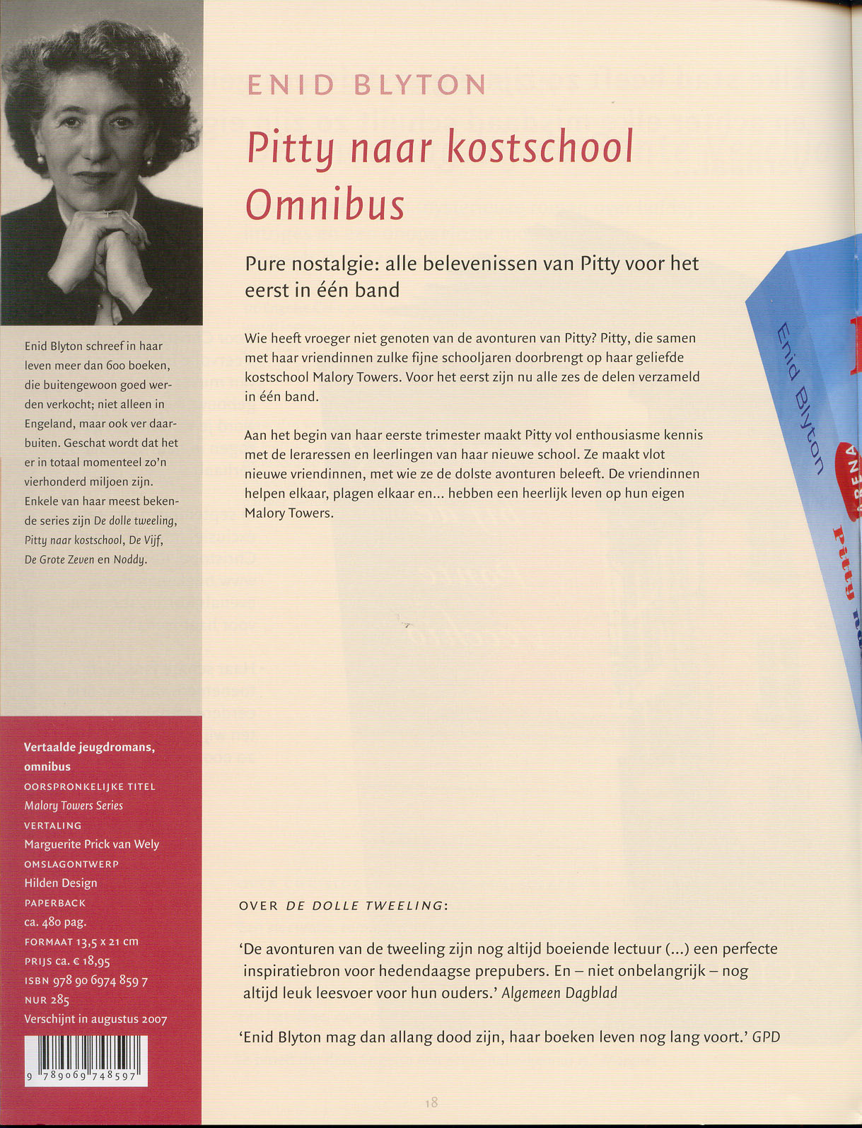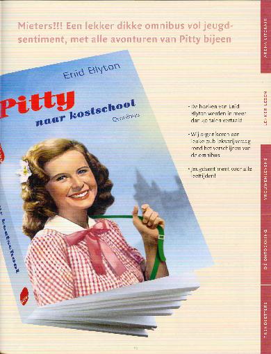 De Pitty-omnibus is verschenen! Hier de pagina uit de catalogus van Uitgeverij Arena: Mijn review: Alle zes de delen in een band. Ik had mijn twijfels toen ik het boek voor het eerst in mijn handen hield. Het boek is dik (bijna 4,5 centimeter, 635 pagina’s) en heeft geen plaatjes. De tekst loopt door, en door, en door. Alleen waar het ene deeltje ophoudt, en het andere deeltje begint, is een blanco pagina als scheidslijn aangehouden. Ik was bang dat het net zo’n boek als ‘De dikke Trom’ zou worden: een boek dat leuk leest, maar dat je nooit helemaal van voor naar achteren zult doorlezen. ‘De dikke Trom’ heb ik dan ook gelezen door er steeds stukjes uit te nemen: gewoon het boek openslaan en daar beginnen met lezen. Iets wat je bij Pitty zeker niet moet doen, omdat dat geen losse avonturen zijn. Maar gelukkig, het blijkt allemaal mee te vallen. En dat komt vooral door de kracht van Enid Blyton. Je begint, en zij neemt je mee. Op de avonturen die Pitty beleeft. Bij de overgang van de verschillende boeken is het even wat raar. Het eind is zo geschreven dat het boek echt uit is, en dat je nieuwsgierig bent naar het volgende deel. Maar gelukkig! Het volgende deel ligt al onder je handen! Ook het beleven van alle avonturen, helemaal van klas 1 tot en met klas 6 is niet zo’n langdradige kost als wat je zou verwachten. Ik herinner me uit mijn jeugd een vriendinnetje van mijn zusje die erg ziek geworden was en in bed moest blijven liggen. Als troost kreeg ze van haar ouders alle zes de delen van Pitty. Dat waren toen zes verschillende boekjes. Het meisje heeft ze alle zes achter elkaar uitgelezen. Er trad geen verveling op na deeltje zoveel. En zo is het ook bij deze omnibus. Alle zes de delen achter elkaar lezen is niet vervelend. Enid Blyton kennende, wil je na elk deeltje dolgraag nog meer boeken lezen. En zo valt zes boeken in een band toch nog heel erg mee. Desondanks blijft het een dik boek. En ik verwacht dat het boek het meest in trek zal zijn bij de mensen die Pitty al kennen en haar avonturen nog eens willen lezen. Voor die mensen zal het heerlijk zijn in een klap alle zes de delen te kunnen kopen. De tekst op de achterkant van het boek hint daar al op: ‘Een lekker dikke omnibus vol jeugdsentiment, met alle avonturen van Pitty bijeen!’ Voor deze mensen is het boek heel geschikt. Neemt niet weg, dat het ook prima te lezen is voor mensen die Pitty voor het eerst leren kennen. Zet dan alleen de gedachte opzij dat je dit boek uit *moet* krijgen. Begin gewoon, en laat je door Enid’s vertelkunst meeslepen. Een minpunt vind ik het gebrek aan illustraties. Ik heb zelf de groene boekjes van de valkenserie van Pitty, en ik mis de illustraties van de voorkanten daar: Pitty met staartjes, en met kleding die past bij de rest van de illustratie. Nu moeten we het doen met slechts een tekening. De Pitty op de voorkant van de omnibus is ook heel anders, en het is even wennen. De bloem in het haar vind ik niets, en het gezicht straalt een zekere onzekerheid uit (het is minder stralend). Maar het gebouw van Malory Towers op de achtergrond vind ik schitterend. En wanneer je aan de tekening bent gewend, kom je tot de ontdekking dat hij toch wel mooi is. De taal is ten opzichte van die in de groene boekjes flink aangepast. Maar voor zover ik kon zien is het ten opzichte van de latere druk uit 1991 niet gewijzigd. Over het algemeen zijn de wijzigingen niet storend. Een keer had ik het gevoel dat door de wijzigingen de sfeer was aangetast. Dat was in de eerste helft van het tweede deel. Maar over het algemeen merk je alleen dat de tekst gewijzigd is omdat je opmerkt: ‘He, maar dat was toch in de oorspronkelijke deeltjes heel anders?’ En soms heb je het idee dat Pitty een iets te moderne kreet slaakt (“Ik heb een te gekke vakantie gehad”). Maar over het algemeen leest het boek gelukkig net zo prettig weg als de oudere uitgaven. Wel heb ik een keer een foutje ontdekt die in de eerdere boekjes niet aanwezig was. Tja, iets te ijverig gecorrigeerd! Tenslotte zijn het gebruikte papier en de gebruikte inkt voor de omnibus prima, en stinken niet. En ook dat is altijd belangrijk voor een goed boek! Verdere bespreking, en reviews van de afzonderlijke delen vind je in het forum. Bekijk de volgende links: Nieuwe uitgave van Pitty. Pitty naar kostschool. Pitty's tweede kostschooljaar. Pitty in de derde. Pitty als vierde klasser. Pitty's vijfde kostschooljaar. Pitty's laatste kostschooljaar. |